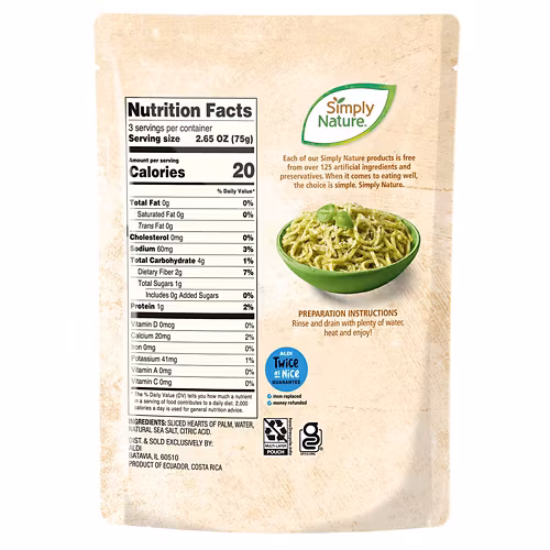 Hearts of palm has a mild vegetable taste — some call it vaguely artichoke-like — and a firmer, slightly al dente mouthfeel than shirataki. Nutritionally, it’s very low in calories and carbs relative to wheat pasta.